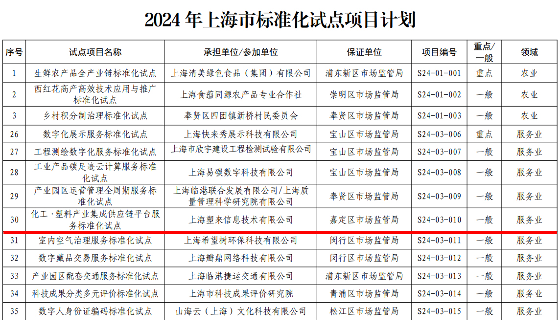 近日,,,上海市市场监督管理局公布56个2024年上海市标准化试点项目计划,,z6com·尊龙凯时旗下化塑汇申报的“化工·塑料产业集成供应链平台服务标准化试点”项目入选,,成功获批立项。。。。